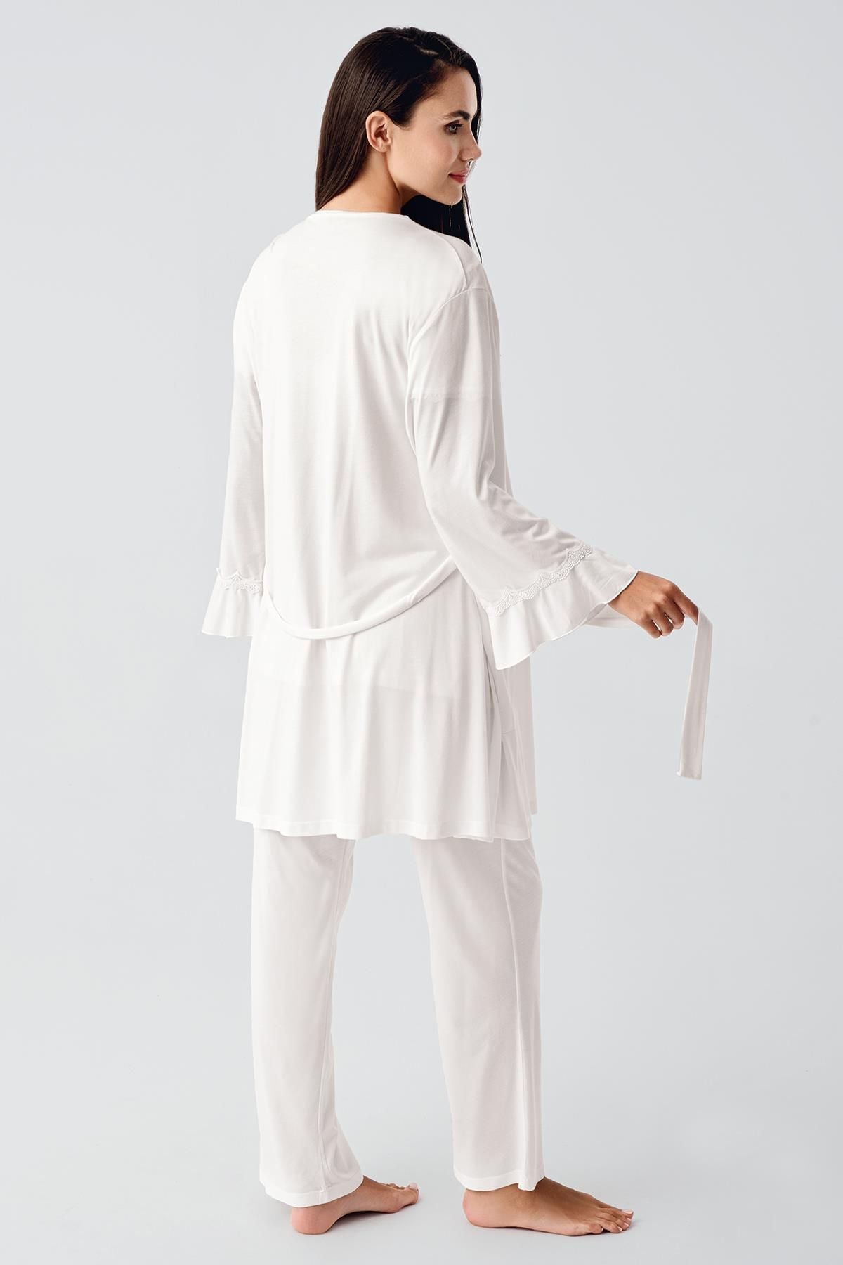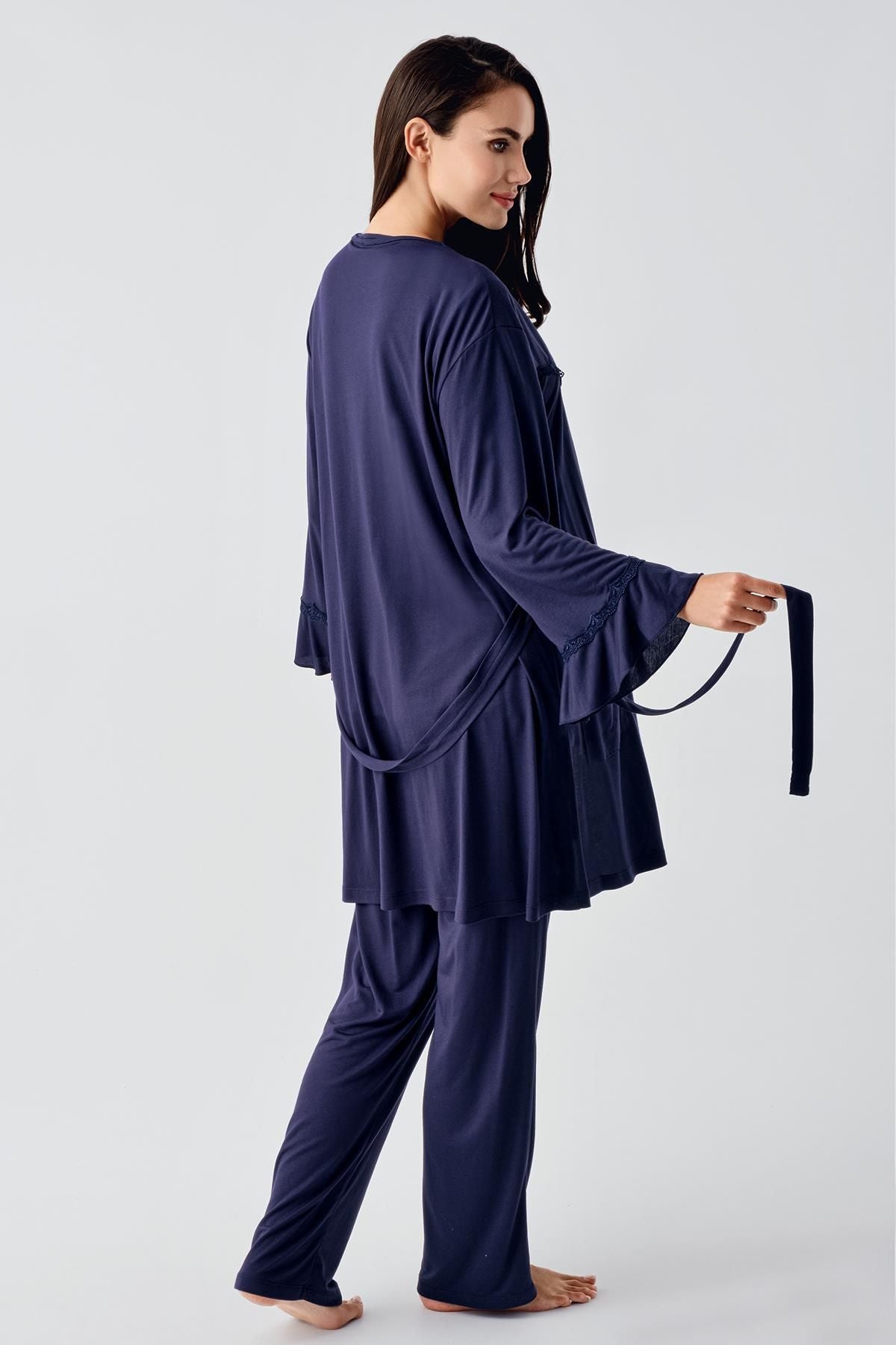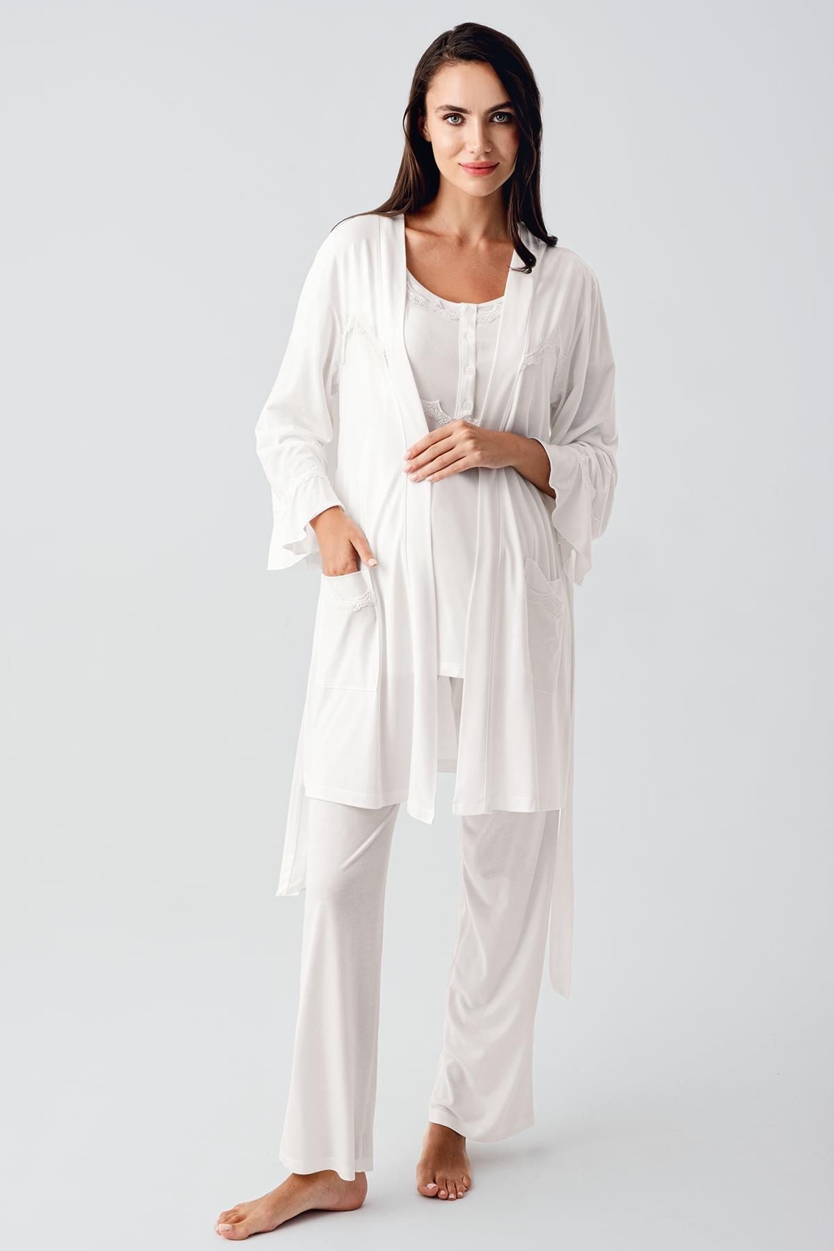 Özellikler: Kumaşı yumuşak ve rahattır. Geniş kalıplıdır Kullanım Amacı: Hem günlük hem de Hamilelik dönemi ve sonrası için kullanıma uygundur. Paket İçeriği: Ürün paketi içerisinden bir adet sabahlık, üst ve bir adet alt pijama çıkmaktadır. Kumaş İçeriği: %80 Viskon , %20 Polyester Manken Ölçüleri: Boy: 1.77, Göğüs:89, Bel:63, Kalça:93 Ürün Ölçüleri: Beden: S | Bedenler arasında çevrede 4-6 cm fark vardır. Yıkama Talimatı: Çamaşır makinesinde 30 derecede yıkanabilir. Elle yıkama yapmayınız.
