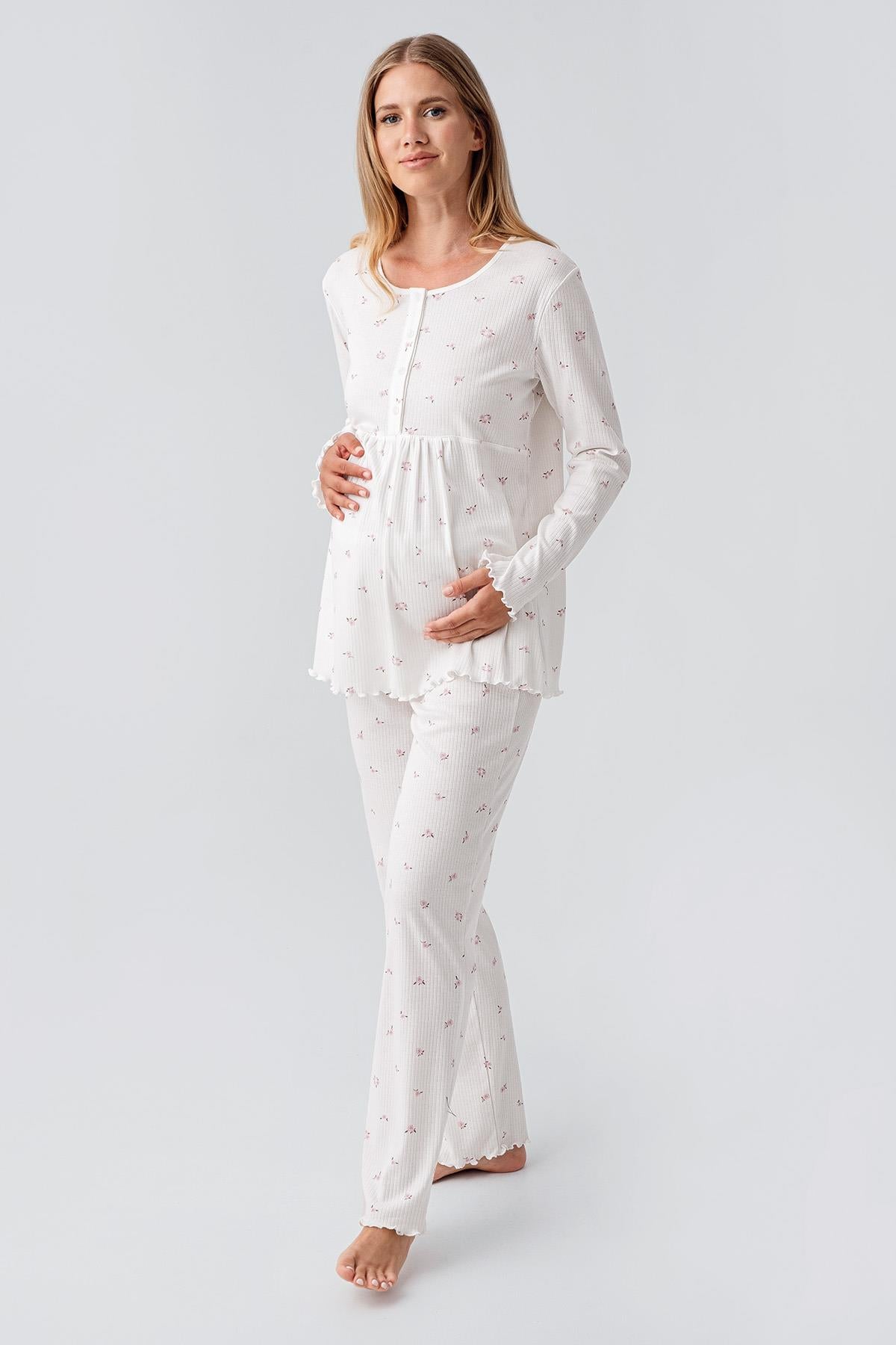 Uzun Kollu Desenli Düğmeli Esnek Pamuklu Hamile Pijama Takım 18218