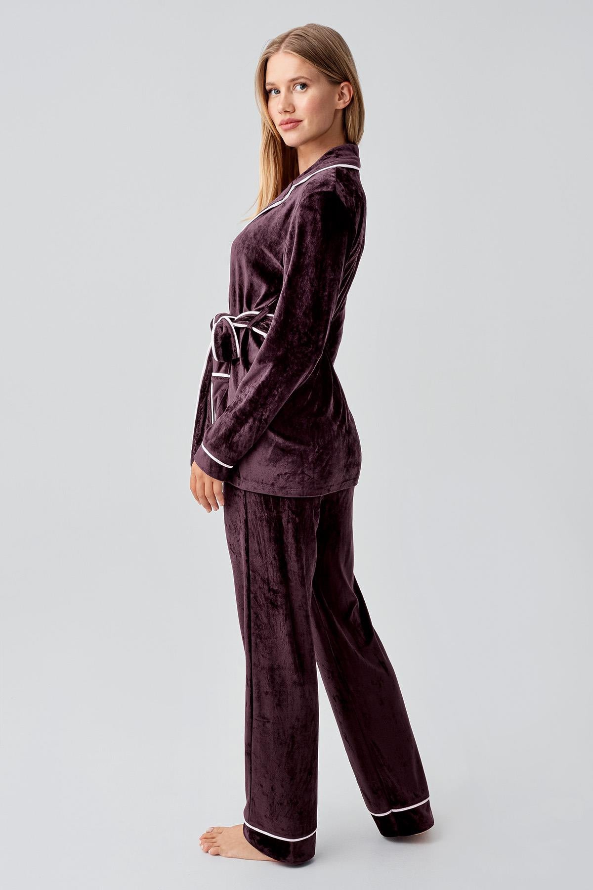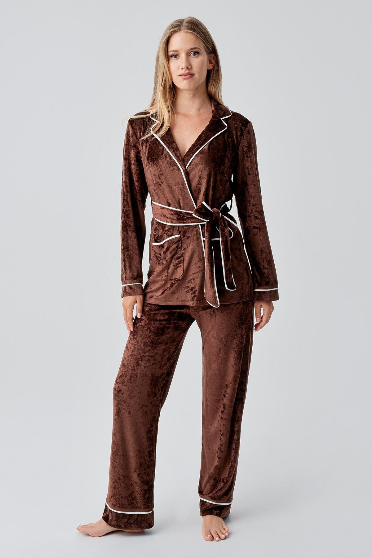%80 viskoz %20 polyester karışımlı kadife kumaştan üretilen kadın kimonolu pijama takımı, yumuşacık dokusuyla teni sararak konforlu bir kullanım sunar. Uzun kollu tasarımı ve kadifenin sıcak tutan yapısı sayesinde özellikle serin havalarda ideal bir seçimdir. Şık kimono detayıyla klasik pijama takımlarına modern bir dokunuş katan bu model, hem rahatlığı hem de zarif görünümü bir arada sunar.