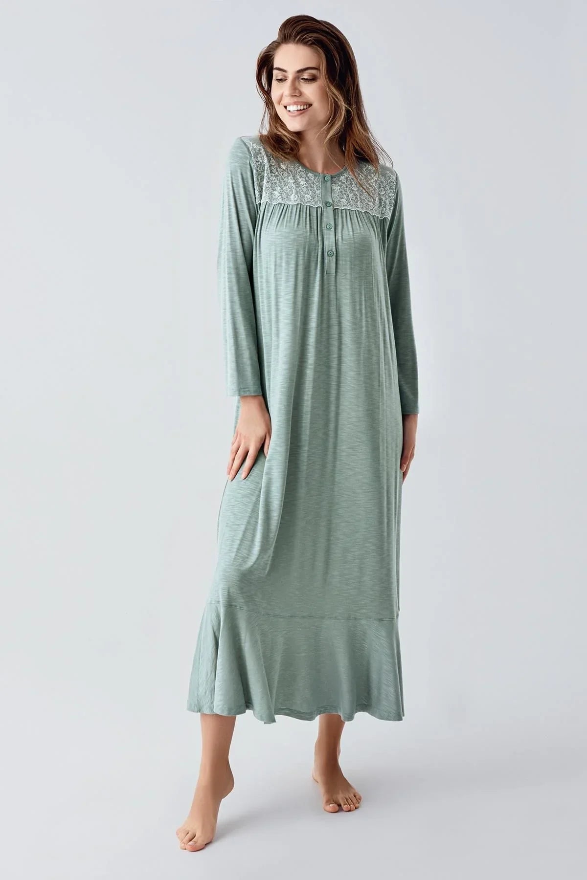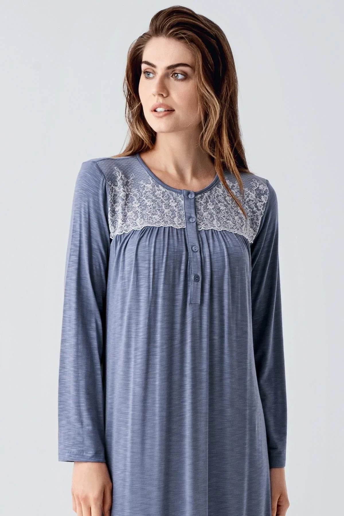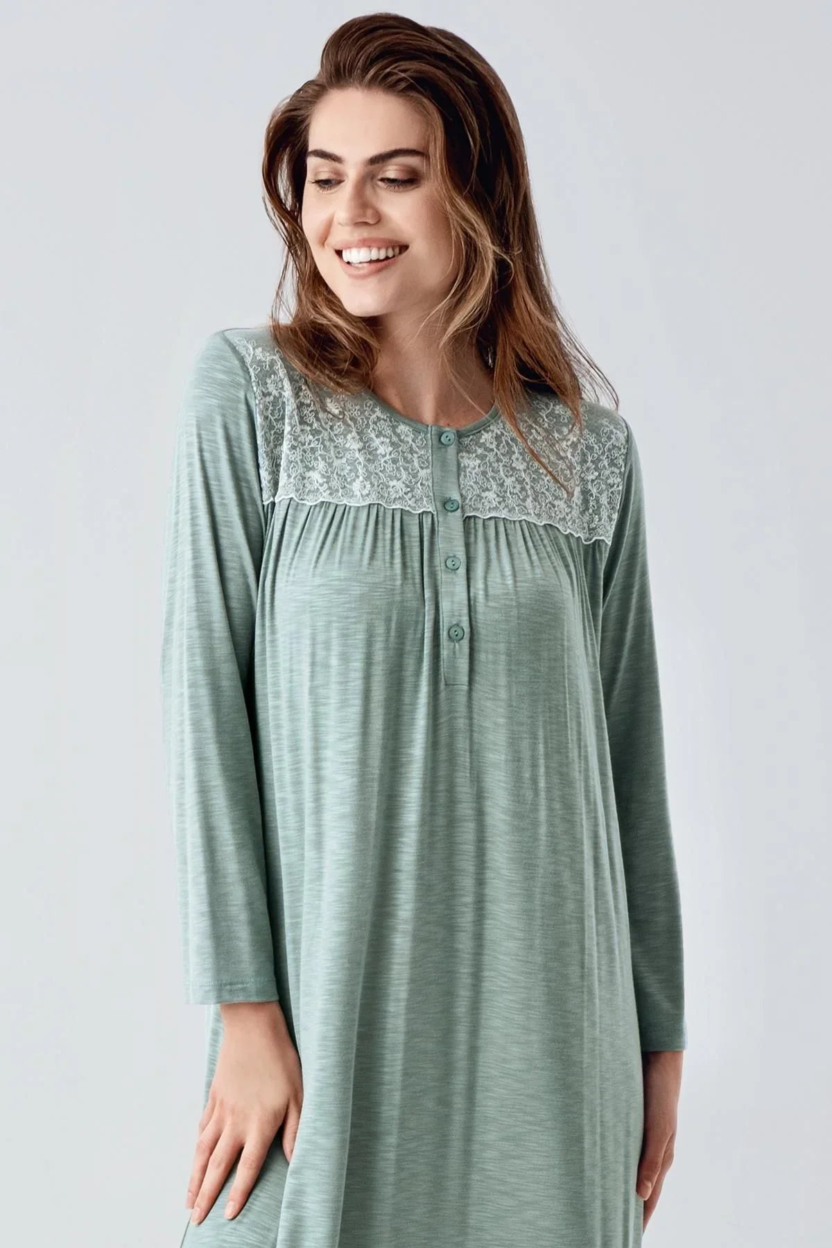 Uzun Kollu Dantelli Düğmeli Esnek Viskoz Gecelik 21108