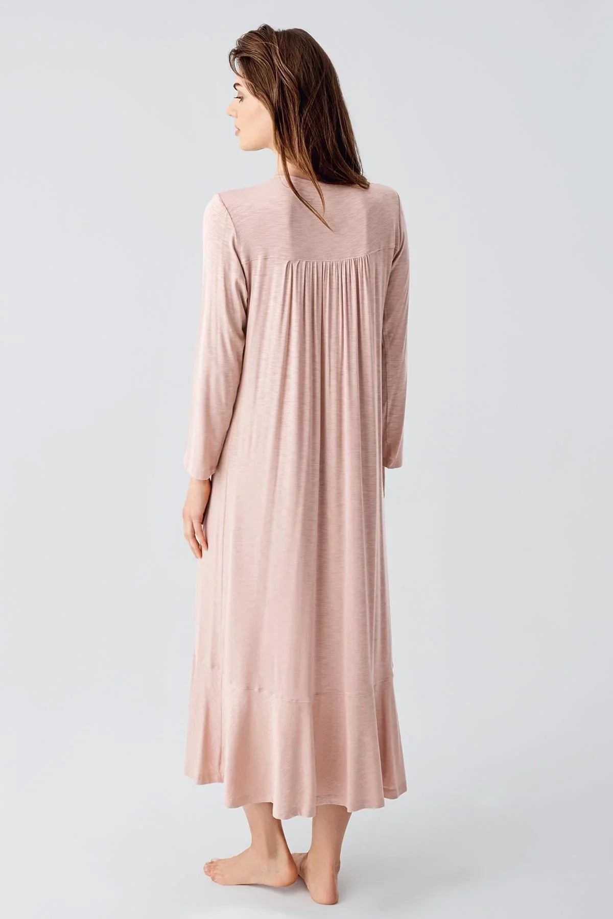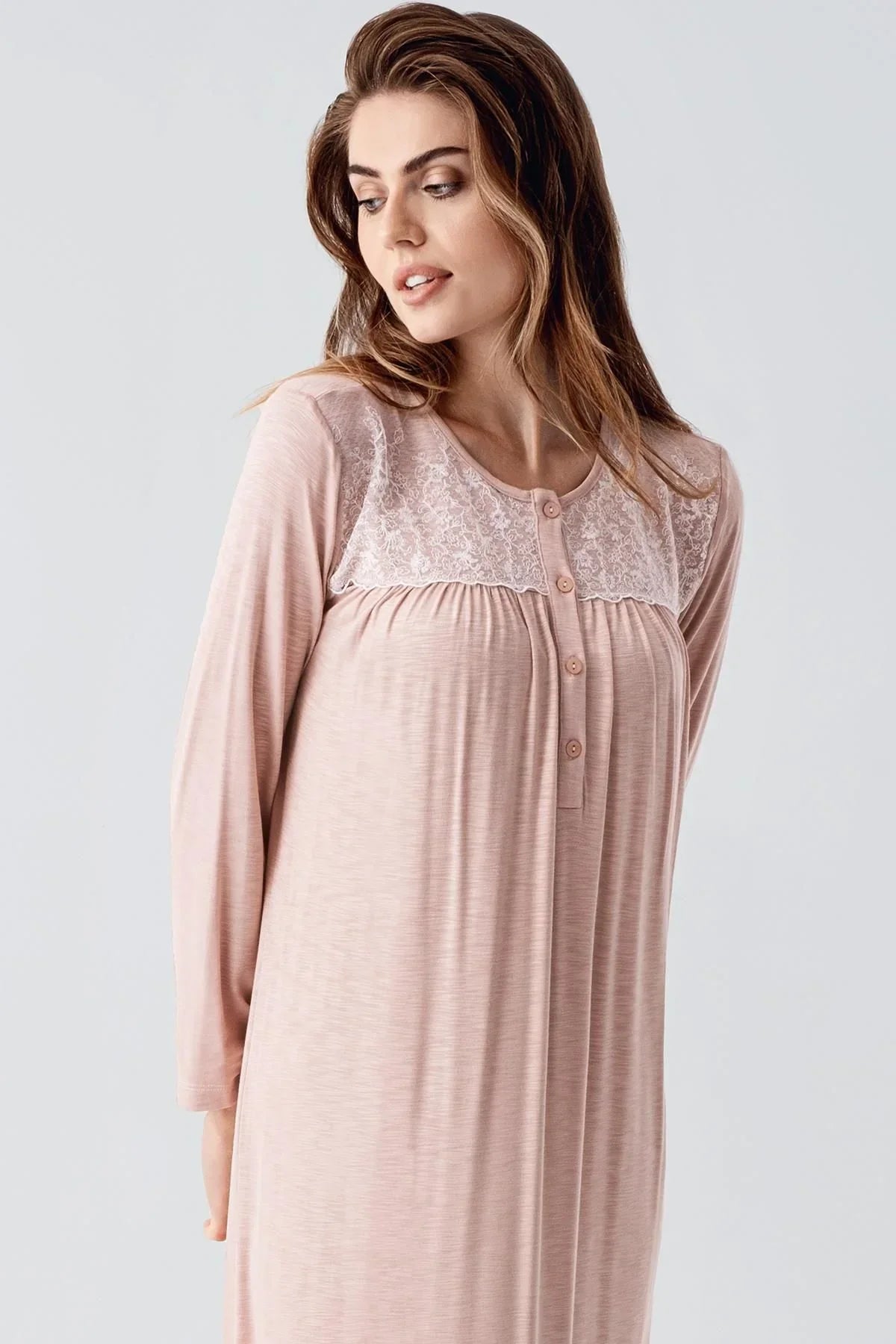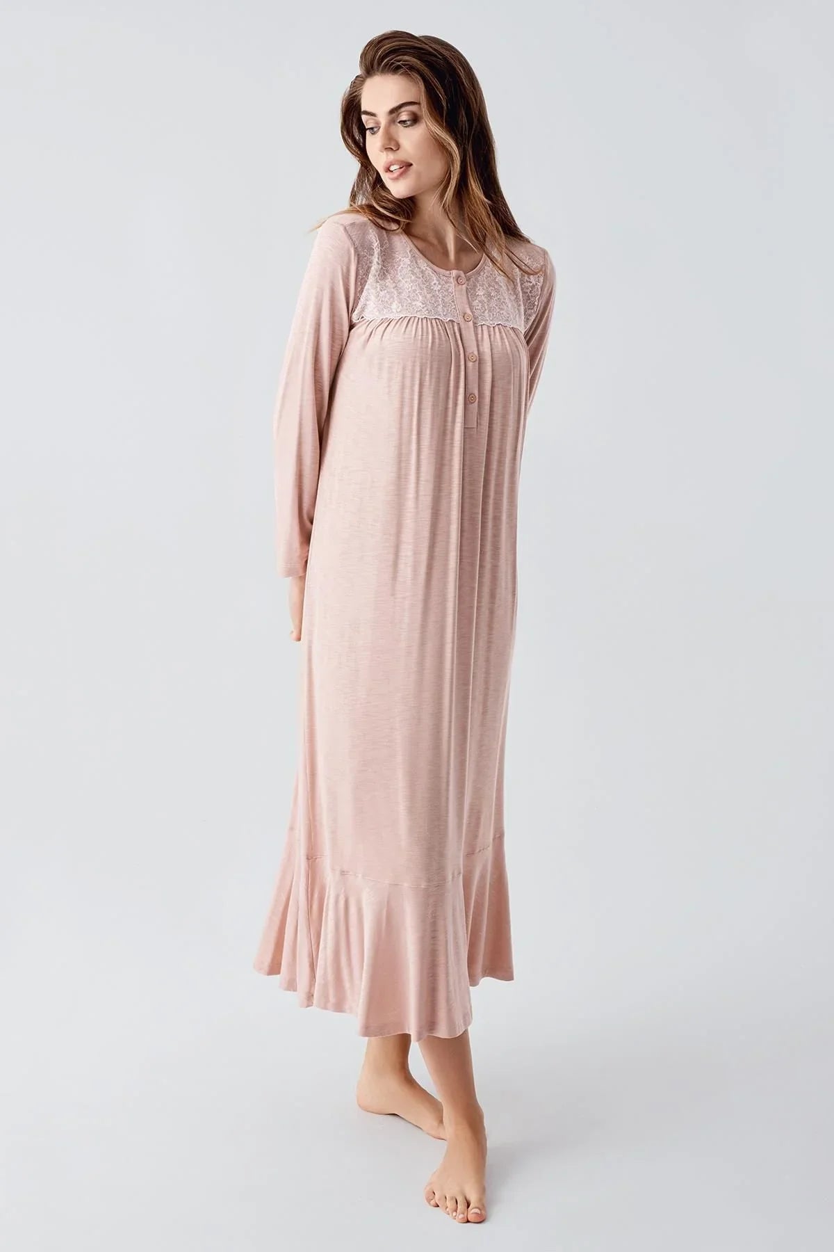 Uzun Kollu Dantelli Düğmeli Esnek Viskoz Gecelik 21108